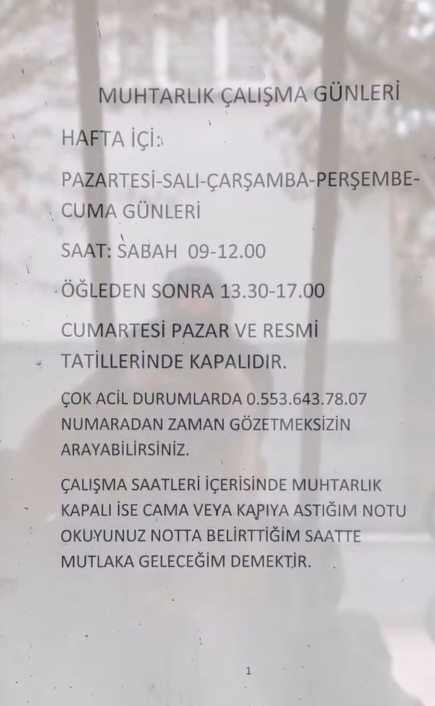 Muhtarın muhtarlıkta bulunmama gerekçesinin ise kombi arızası olduğu ifade edildi. Öte yandan muhtarlık binasının camına asılan bilgilendirme yazısında, muhtarlığın hafta içi 09.00–12.00 ve 13.30–17.00 saatleri arasında hizmet verdiği, hafta sonları ve resmi tatillerde kapalı olduğu belirtildi. Fakat bir mahalle sakini, sabah saat 10:10'da muhtarlığa gittiğini ve muhtarın yerinde olmadığı ifade edildi.