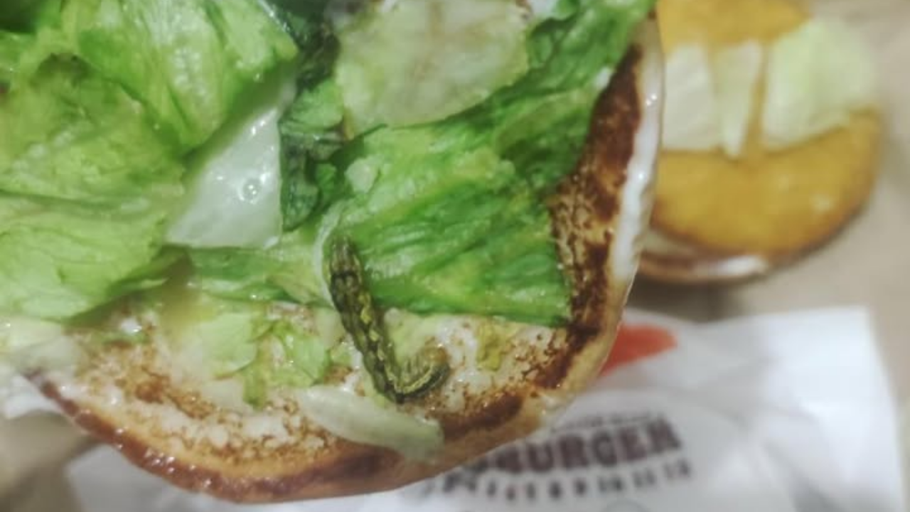 Paylaşılan görüntüde, hamburgerin içindeki bozulmuş ürün kısmında kurt olduğu görülüyor.