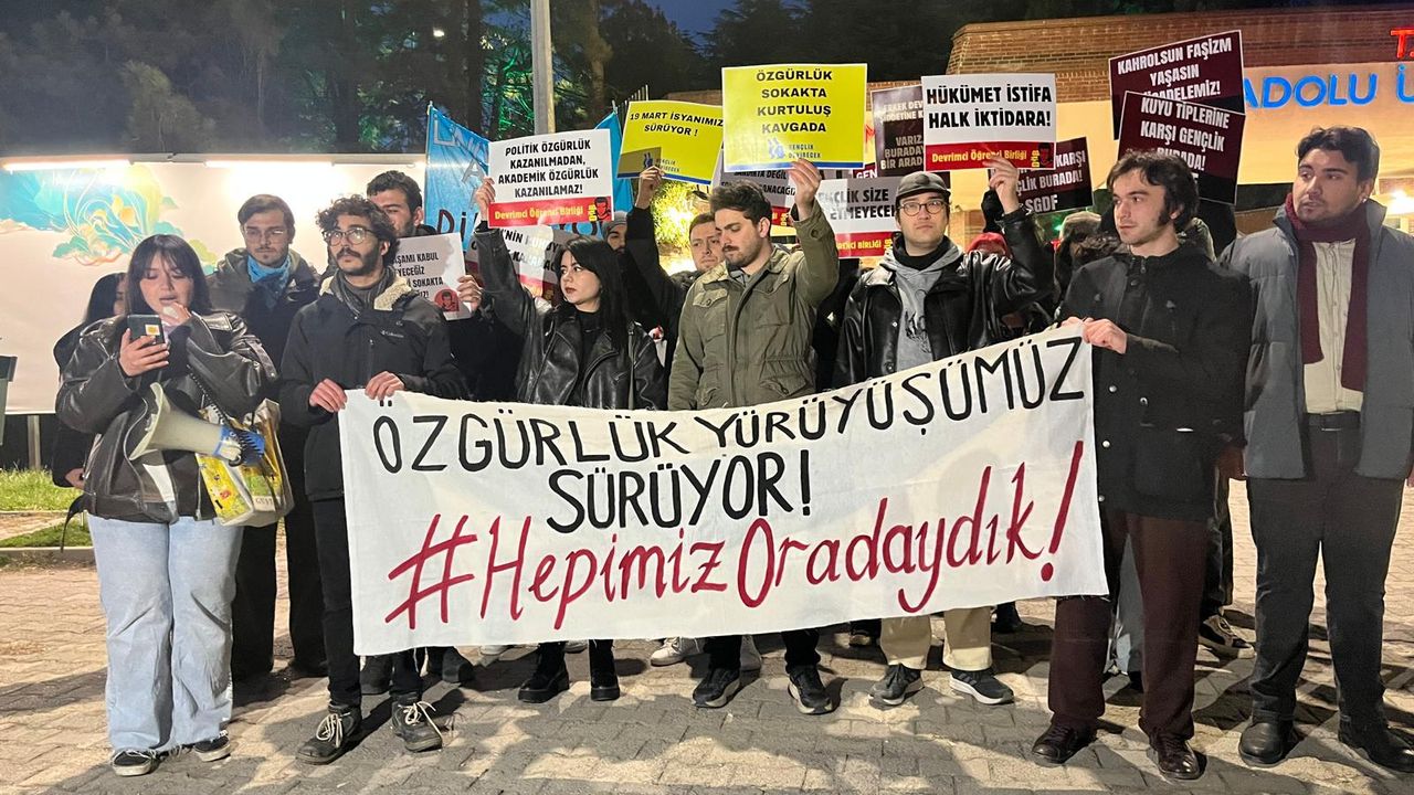 Eskişehir’de Devrimci Öğrenci Birliği, EHP Gençlik, Özgür Genç Kadın ve Sosyalist Gençlik Dernekleri Federasyonu (SGDF), 19 Mart eylemlerine katıldıkları gerekçesiyle tutuklanan dört öğrenciye dikkat çekmek amacıyla yürüyüş düzenledi.