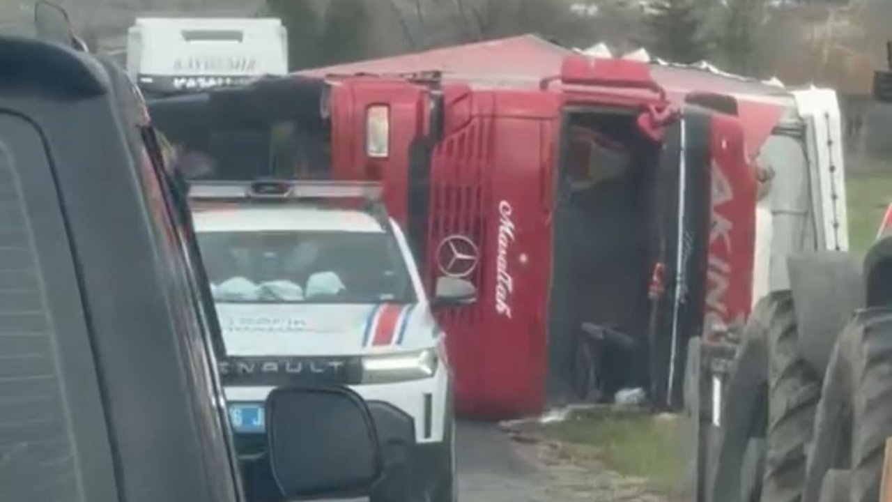 Kontrolden çıkan TIR yan yatarak devrildi. Olay yerine polis ekipleri sevk edildi. Büyük bir facianın sönülürken, TIR sürücüsüyle ilgili bir bilgiye ulaşılamadı.