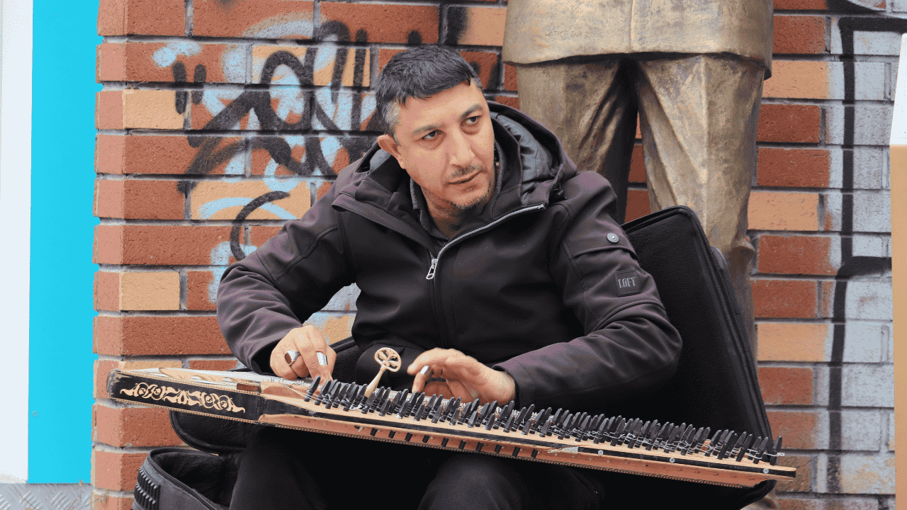 Parmaklarına taktığı mızraplarla kanun çalan bir müzisyen, soğuk havaya aldırmadan performansına devam ederek yoldan geçenlerin ilgisini topladı. Kalın montunu giyip enstrümanının başına geçen sanatçı, sergilediği azim ve müzik sevgisiyle vatandaşlara keyifli anlar yaşattı.