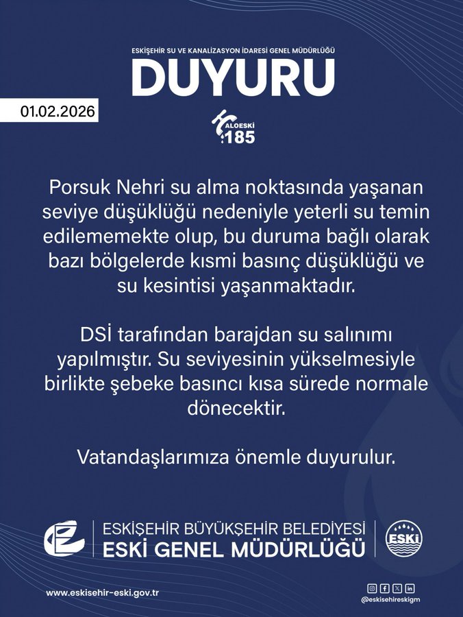 Yapılan açıklama, "Porsuk Nehri su alma noktasında yaşanan seviye düşüklüğü nedeniyle yeterli su temin edilememekte olup, bu duruma bağlı olarak bazı bölgelerde kısmi basınç düşüklüğü ve su kesintisi yaşanmaktadır. DSİ tarafından barajdan su salınımı yapılmıştır. Su seviyesinin yükselmesiyle birlikte şebeke basıncı kısa sürede normale dönecektir. Vatandaşlarımıza önemle duyurulur." denildi.
