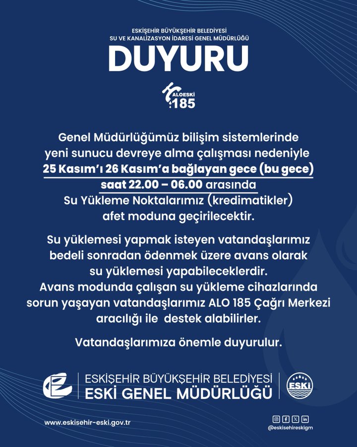 Eskişehir Su ve Kanalizasyon İdaresi (ESKİ) Genel Müdürlüğü, bilişim sistemlerinde yeni sunucu devreye alma çalışmaları kapsamında önemli bir duyuru yaptı. Buna göre, 25 Kasım’ı 26 Kasım’a bağlayan gece saat 22.00 ile 06.00 arasında su yükleme noktaları (kredimatikler) afet moduna geçirilecek.