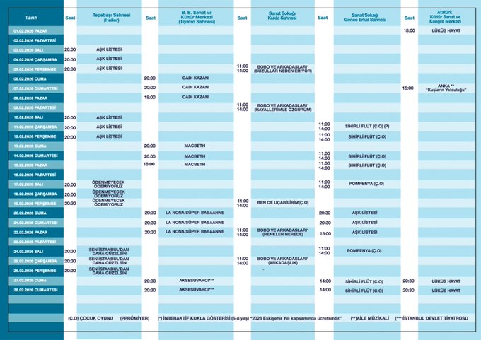 Eskişehir Şehir Tiyatroları’nın 2026 Şubat ayı oyun programı, her yaştan izleyiciye hitap eden içeriğiyle dikkat çekiyor. Oyunlara ilişkin bilet ve detaylı bilgiler, Eskişehir Şehir Tiyatroları’nın resmi kanalları üzerinden takip edilebilecek.