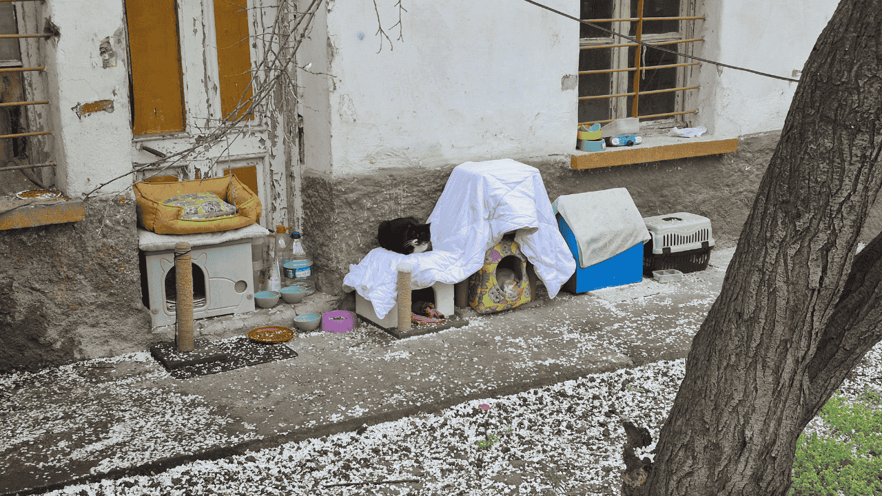 Bahçeye çok sayıda kedi kulübesi, tırmalama alanı ile mama ve su kapları yerleştirildi.