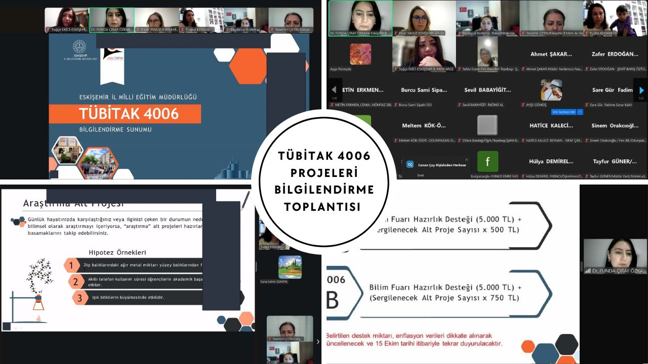 Eskişehir İl Milli Eğitim Müdürlüğü, TÜBİTAK 4006 Bilim Fuarları projeleri hakkında bilgilendirme toplantısı gerçekleştirdi. Müdürlük Ar-Ge birimi koordinesinde düzenlenen çevrim içi toplantıda, TÜBİTAK İl Koordinatörü Dr. Funda Çıray Özkara sunum yaptı.