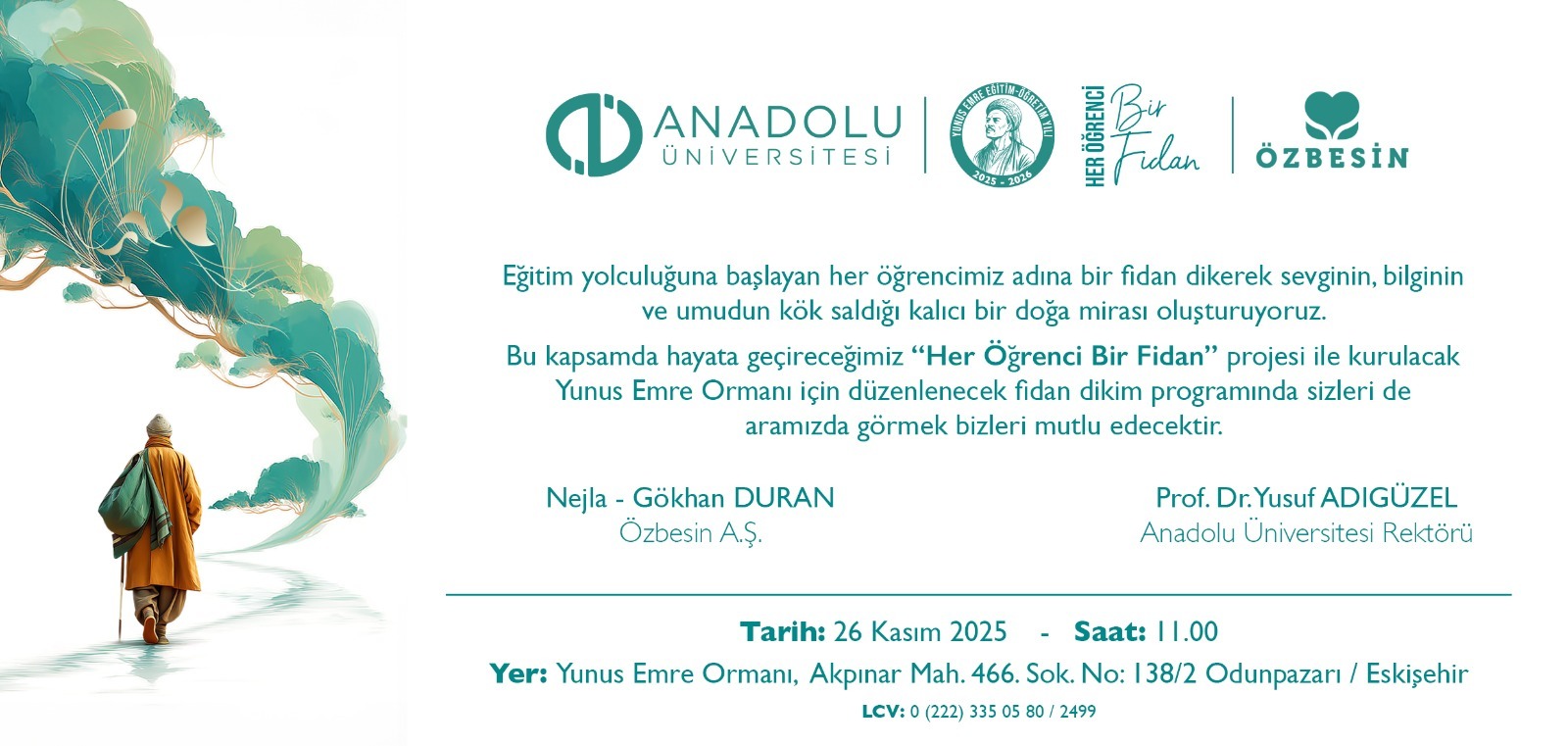 Anadolu Üniversitesi, 2025–2026 öğretim yılında başlatacağı “Her Öğrenci Bir Fidan” projesiyle çevre bilincini güçlendirmeyi hedefliyor. Proje kapsamında, üniversiteye başlayan her öğrenci adına bir fidan dikilecek ve bu fidanlarla Yunus Emre Ormanı kurulacak.
