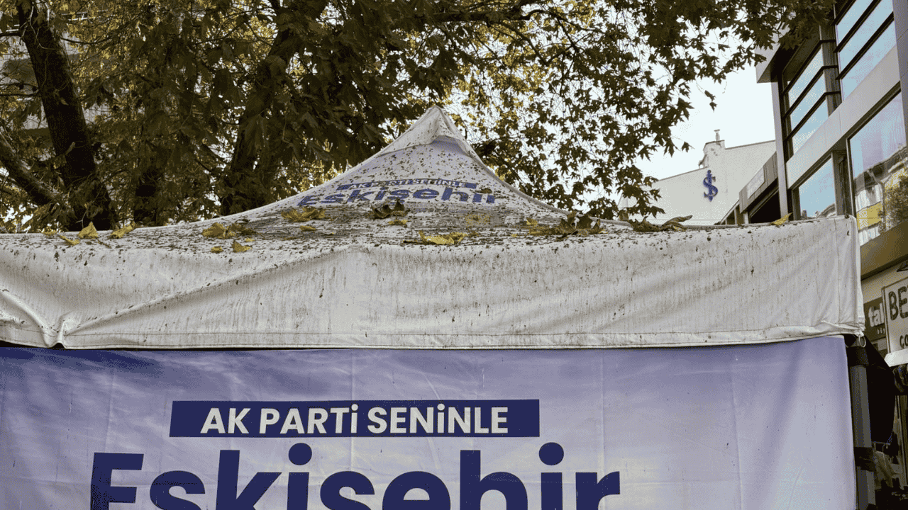 Eskişehir Hamamyolu Caddesi’nde, AK Parti üye çadırının üzerinde olan yapraklar ve toz birikintileri dikkati çekti.