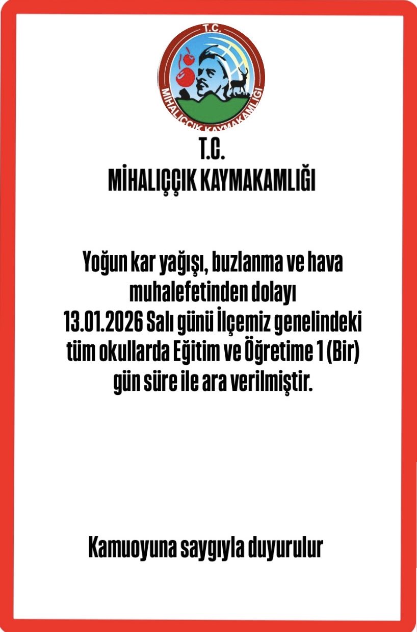 Mihalıççık Kaymakamlığı tarafından yapılan açıklamada, “Yoğun kar yağışı, buzlanma ve olumsuz hava şartları nedeniyle 13 Ocak 2026 (Salı) günü ilçemiz genelindeki tüm okullarda eğitim-öğretime 1 gün süreyle ara verilmiştir” ifadelerine yer verildi.