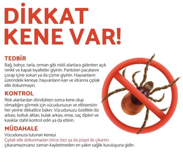 Yapılan uyarıda KKKA’dan korunmak için uzun kollu giysiler giymek, açık renkli kıyafet tercih etmek, vücutlarına kene tutunup tutunmadığını düzenli olarak kontrol etmek ve mümkünse keneye karşı sprey kullanılması gerektiği ifade edildi.