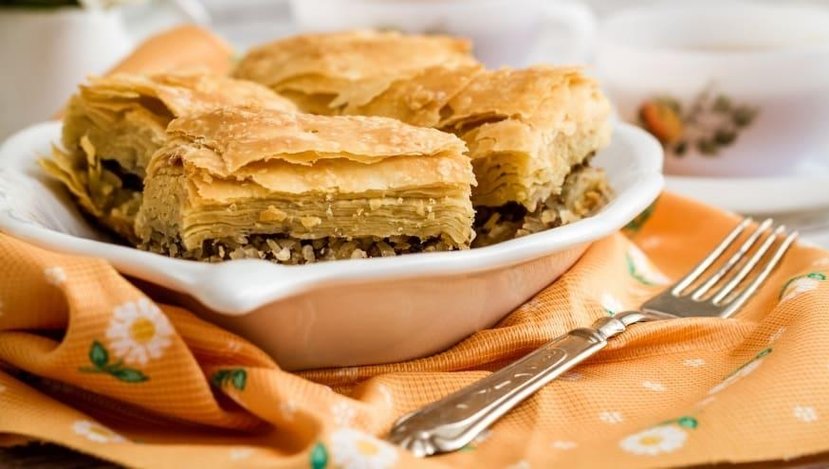 Dinlenen hamur bezelerini tek tek oklavayla açın. Yufkaların arasını güzelce yağlayarak tepsiye yerleştirin ve tam ortasına hazırladığınız iç harcı koyun. Kalan yufkaları üst üste serip kenarlarını iyice kapatın. Üzerini yağlayıp her iki tarafı da kızarana kadar pişirin.