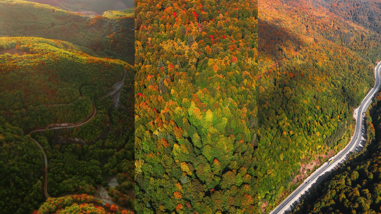 Kıvrımlı yollardan geçen sürücüler, çevresindeki ağaçların sonbahar renklerine büründüğü manzaranın keyfini çıkararak yolculuk yapıyor.
