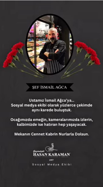 "Ustamız İsmail Ağca'ya... Sosyal medya ekibi olarak yüzlerce çekimde aynı karede buluştuk. Ocağımızda emeğin, kameralarımızda izlerin, kalbimizde ise hatıran hep yaşayacak. Mekanın Cennet Kabrin Nurlarla Dolsun."