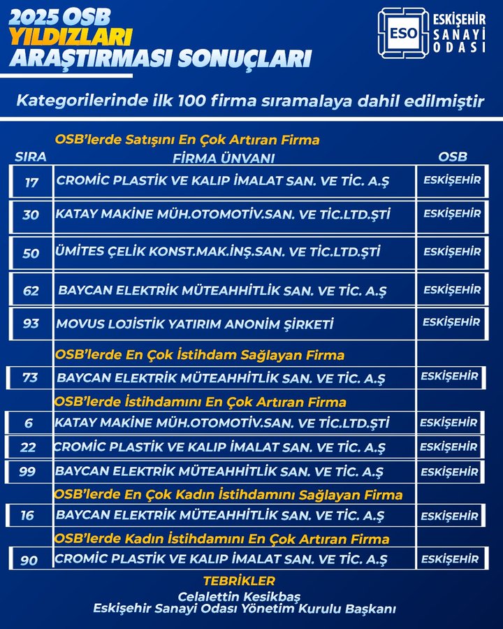 Açıklanan rapora göre, “Satışını En Çok Artıran Firmalar” kategorisinde Eskişehir’den 5 firma listeye girmeyi başardı: