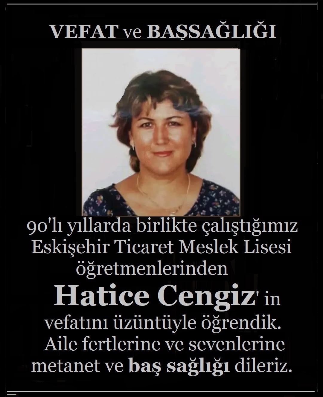 Eskişehir Ticaret Meslek Lisesi öğretmenlerinden Hatice Cengiz hayatını kaybetti.