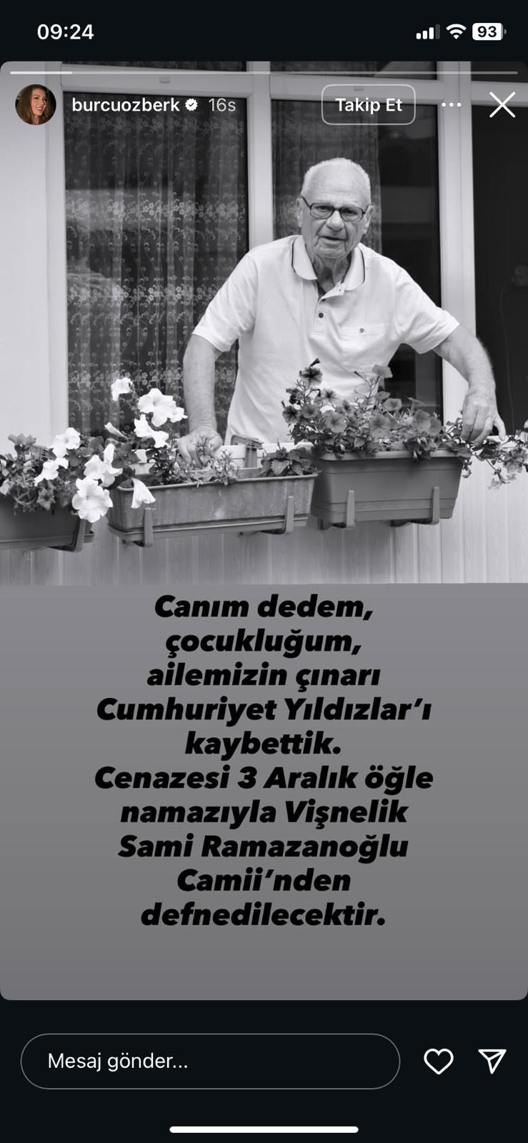 Hayatını kaybeden dedesinin fotoğrafını paylaşan ünlü oyuncu, ''Canım dedem, çocukluğum, ailemizin çınarı Cumhuriyet Yıldızlar'ı kaybettik. Cenazesi 3 Aralık öğle namazıyla Vişnelik Sami Ramazanoğlu Camii'nden defnedilecektir" ifadelerine yer verdi.