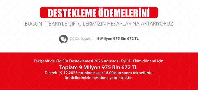 Eskişehir'de Çiğ Süt Desteklemesi 2025 Ağustos - Eylül - Ekim dönemi için Toplam 9 Milyon 975 Bin 672 TL Destek 19.12.2025 tarihinde saat 18.00'dan sonra tek seferde üreticilerimizin hesabına yatırılacaktır.