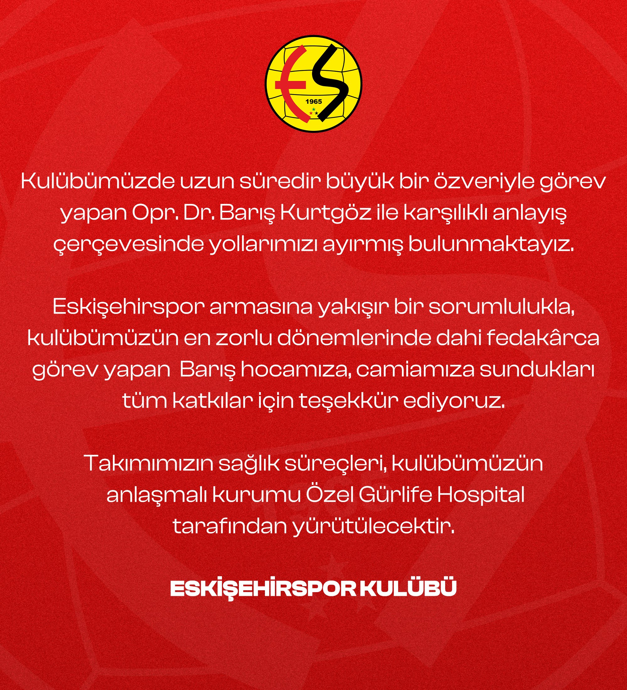 Eskişehirspor Kulübü, uzun yıllardır büyük bir özveriyle görev yapan Opr. Dr. Barış Kurtgöz ile karşılıklı anlayış çerçevesinde yollarını ayırdığını açıkladı.