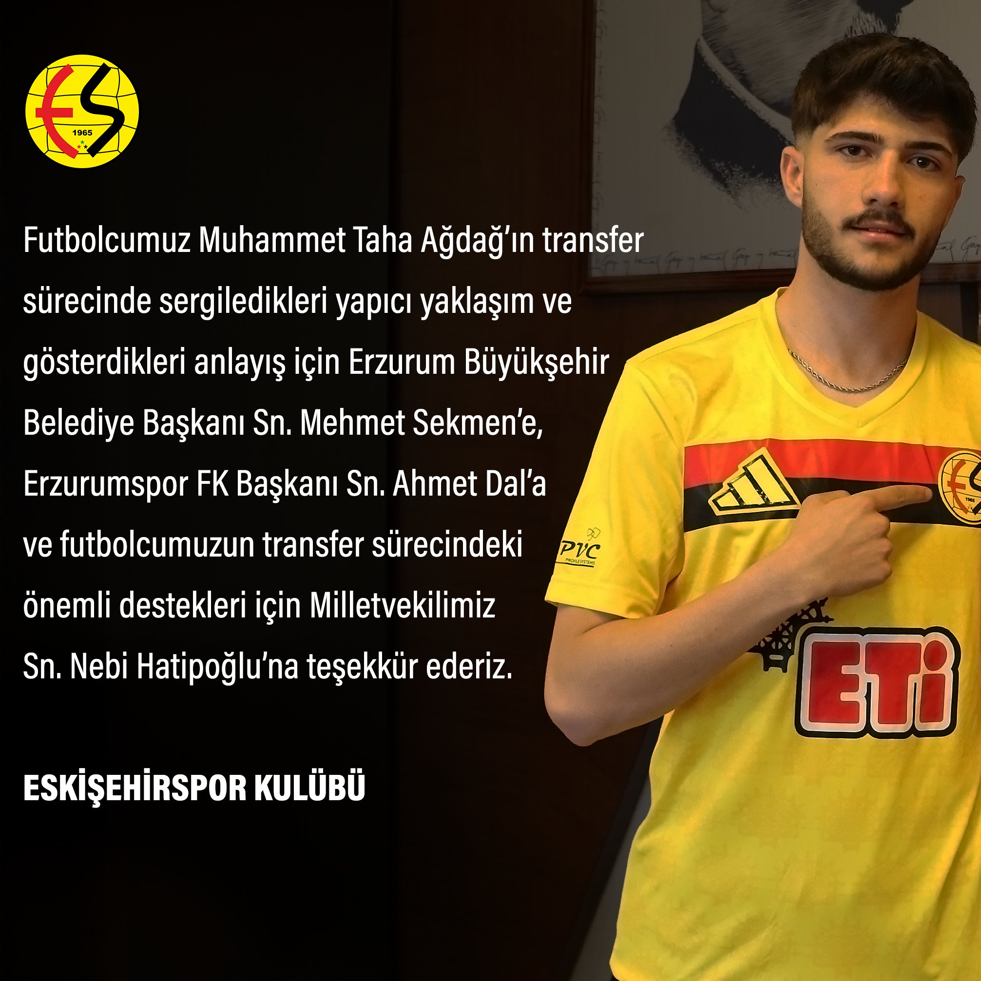 Futbolcumuz Muhammet Taha Ağdağ'ın transfer sürecinde sergiledikleri yaklaşımlar ve gösterdikleri anlayışlar için Erzurum Büyükşehir Belediye Başkanı Sn. Mehmet Sekmen'e, Erzurumspor FK Başkanı Sn. Ahmet Dal'a ve futbolcumuzun transfer sürecindeki önemli destekleri için Milletvekilimiz Sn. Nebi Hatipoğlu'na teşekkür ederiz.