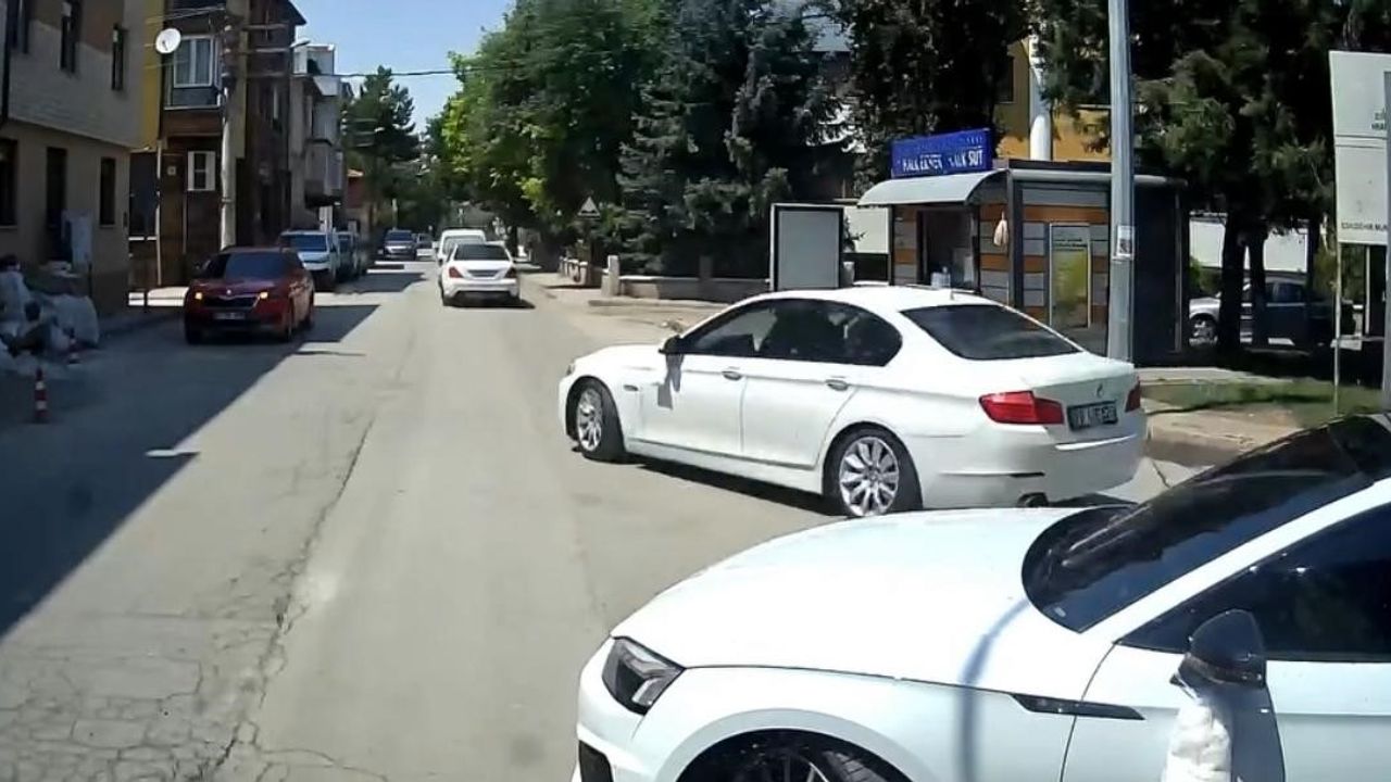 Eskişehir’de düğün konvoyuna geçiş önceliği sağlamak isteyen bir sürücü, trafiği kendi inisiyatifiyle durdurdu. O anlar başka bir aracın kamerasına saniye saniye yansıdı.