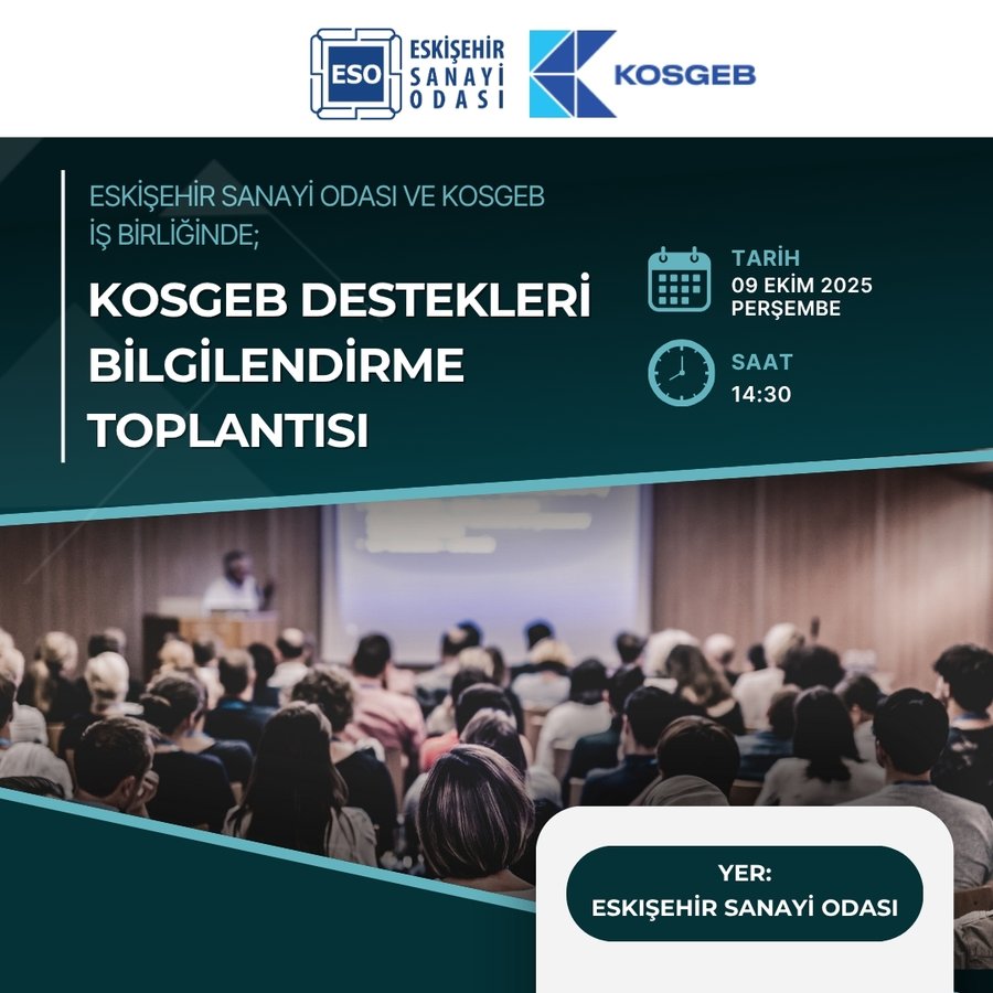 Yapılan duyuruda, "Eskişehir Sanayi Odası (ESO) ve KOSGEB iş birliğinde 09 Ekim 2025 Perşembe günü saat 14:00'te Eskişehir Sanayi Odası'nda "KOSGEB DESTEKLERİ BİLGİLENDİRME PROGRAMI" kapsamında "Girişimci Destek Programı İş Geliştirme Desteği" ile "Kapasite Geliştirme Destek Programı Tanıtım Toplantısı" gerçekleştirilecektir. Toplantıya katılım için yukarıdaki link üzerinden kayıt olabilirsiniz." denildi.
