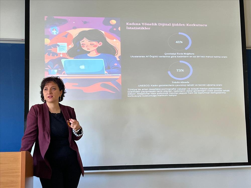 Seminerde, dijital teknolojilerin kadınlara yönelik şiddetin yeni biçimlerini nasıl şekillendirdiği ele alındı. Dr. Uğur, deepfake manipülasyonları, siber taciz türleri, kişisel veri güvenliği ve mahremiyet ihlalleri gibi konuları güncel örneklerle anlattı. Yapay zekâ tabanlı içerik üretim araçlarının kötüye kullanımının kadınların çevrimiçi ve fiziksel güvenliğini tehdit ettiğini vurgulayan Dr. Uğur, dijital şiddetle mücadelede hukuki mekanizmaların güçlendirilmesi, dijital okuryazarlığın artırılması ve toplumsal farkındalığın yükseltilmesi gerektiğini belirtti.