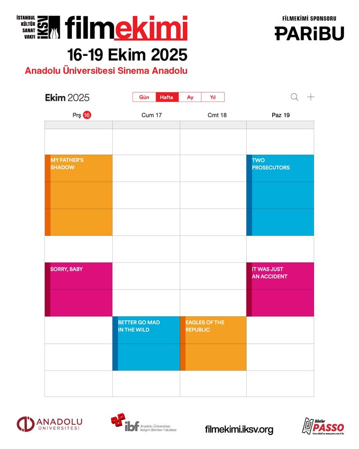 Eskişehir gösterimleri 16-19 Ekim 2025 tarihleri arasında Anadolu Üniversitesi’nin kültür sanat hayatına değer katan salonu Sinema Anadolu’da gerçekleştirilecek. Eskişehir programında 16 seçkin film yer alıyor. Dört gün boyunca dünyanın farklı köşelerinden ödüllü yapımlar ve usta yönetmenlerin son filmleri Eskişehirli sinemaseverlerle buluşacak.