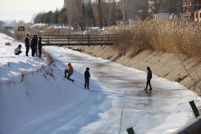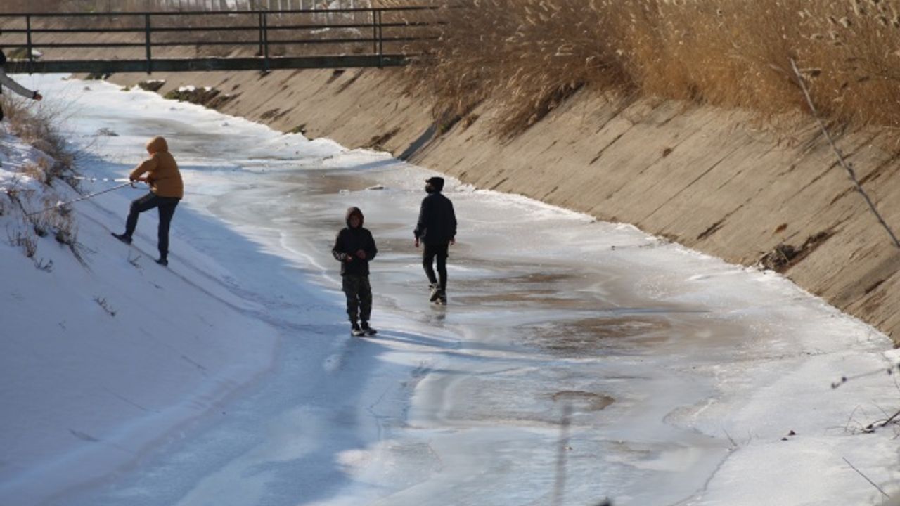 Çocukların buzda yürüdüğü anlar kameralara yansıdı. Kanalın içerisinde çocukları gören vatandaşlar şaşkınlıklarını gizleyemedi.