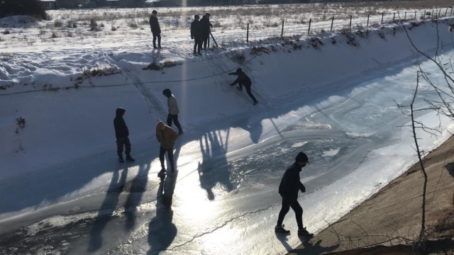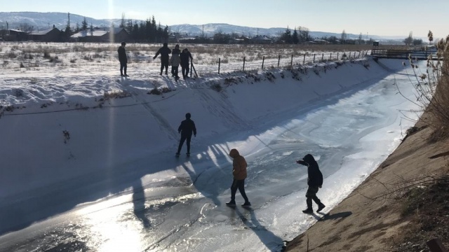 Eskişehir’in Çamlıca Mahallesi’nde bulunan sulama kanalı, soğuk havanın etkisiyle dondu. Buzla kaplanan kanalı gören çocuklar, donan suyun üzerinde yürüdü.