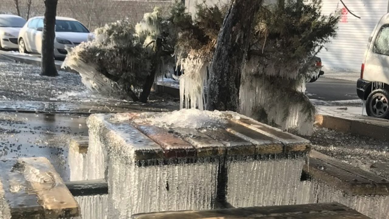 Eskişehir’de arıza yapan fıskiye otomatiği soğuk havanın da etkisiyle parkın buz tutmasına neden olurken, ortaya eşsiz görüntüler çıktı.