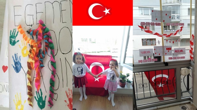 Eskişehir'de evden çıkamayan çocuklar, evlerinin balkon ve camlarını Türk bayraklarıyla süsledi.