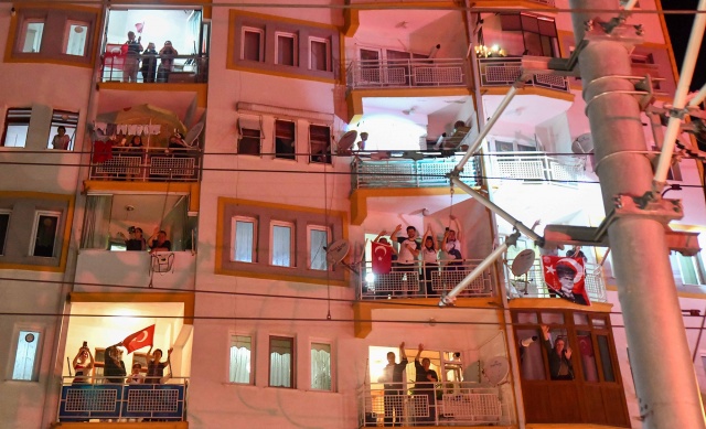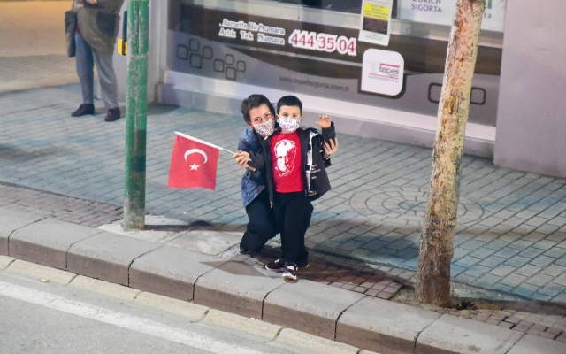 Kent sakinleri, evlerinin önünden geçen korteje, ellerinde bayraklar ve Atatürk posterleri ile cam ve balkonlara çıkarak karşılık verdi.