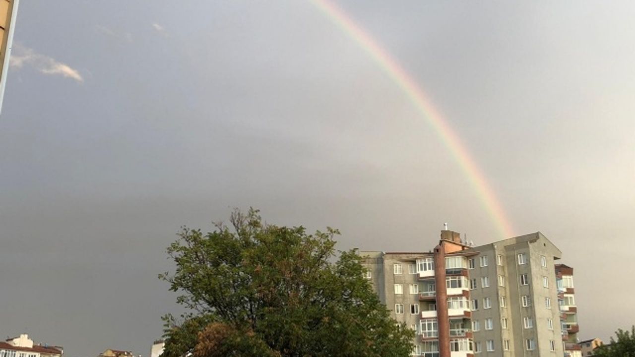 Kendini gösteren güneşle birlikte kentin semasını yarım daire şeklinde kaplayan gökkuşağı, seyrine doyumsuz güzel bir görüntü oluşturdu.