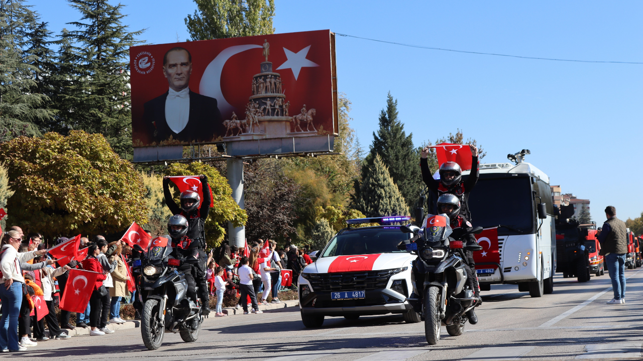 Törende, Eskişehir Valisi Hüseyin Aksoy, tören aracından askeri birlikler ve vatandaşlarla bayramlaşarak etkinliğe başladı. Ardından, Türk Havacılık ve Uzay Sanayii A.Ş. (TUSAŞ) saldırısında şehit düşen vatandaşlar için saygı duruşunda bulunuldu ve askeri bando eşliğinde İstiklal Marşı okundu. Vali Aksoy'un günün anlamını vurguladığı konuşmanın ardından, öğrenciler şiirler okudu ve halk oyunları sergilendi. Program, askeri uçakların gösteri uçuşu ve resmi geçit töreni ile sona erdi.