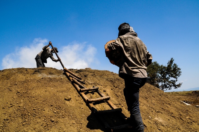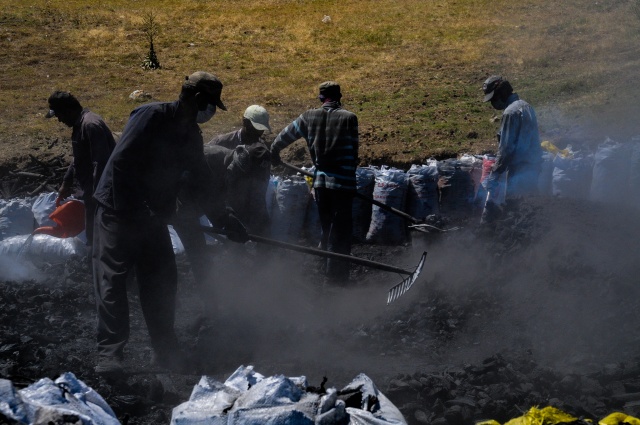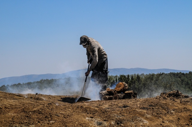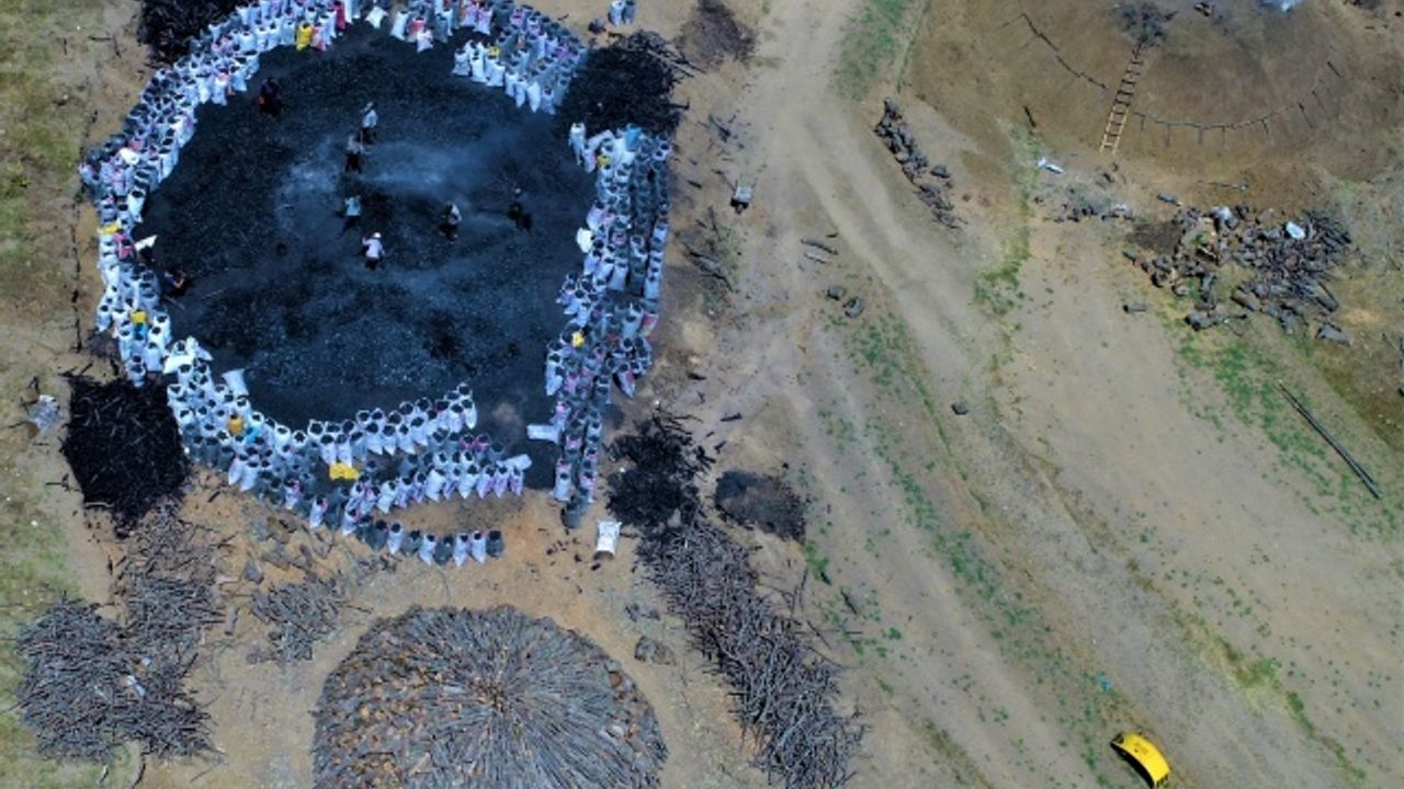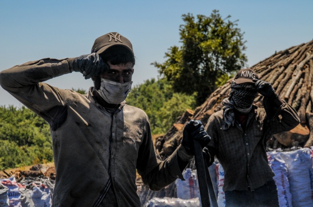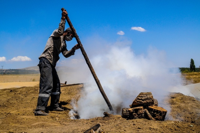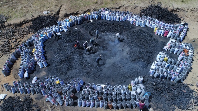 Diyarbakır’dan Eskişehir’in Sarıcakaya ilçesindeki Bey Yaylası’na gelen mevsimlik işçiler, meşe odunlarından mangal kömürü üretiyor. Önce toplanan odun parçaları günlerce süren çalışmanın ardından tepe şeklinde diziliyor.