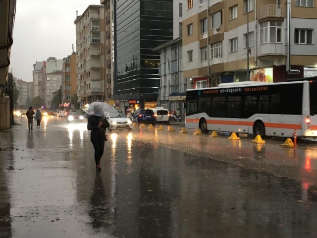 Eskişehir’de akşam saatlerinde etkili olan sağanak yağış, hazırlıksız yakalanan vatandaşların saçak altlarına sığınmasına neden oldu.