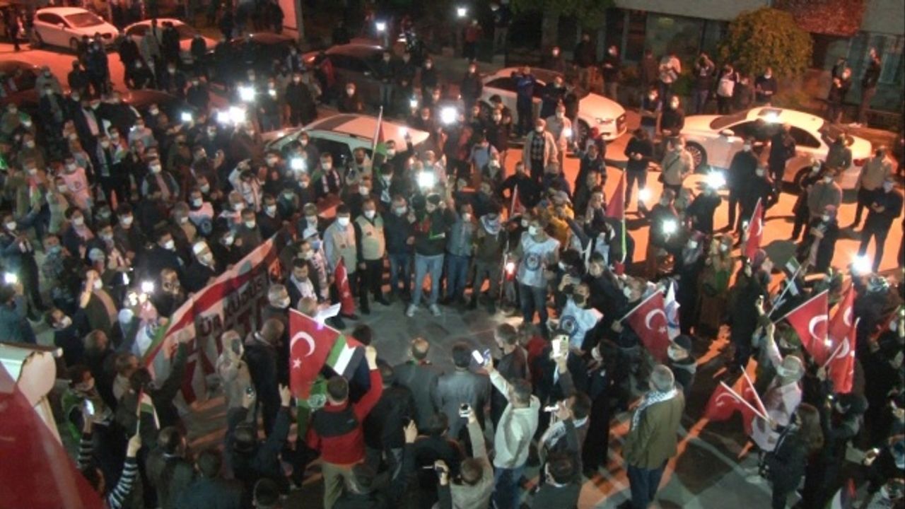 Basın açıklaması sık sık tekbirlerle ile bölünürken vatandaşlar ellerindeki Türk ve Filistin bayraklarını sallayarak tepkilerini dile getirdi.