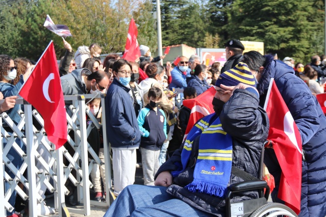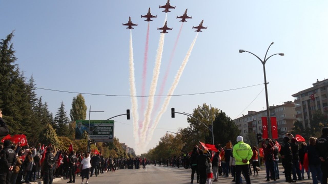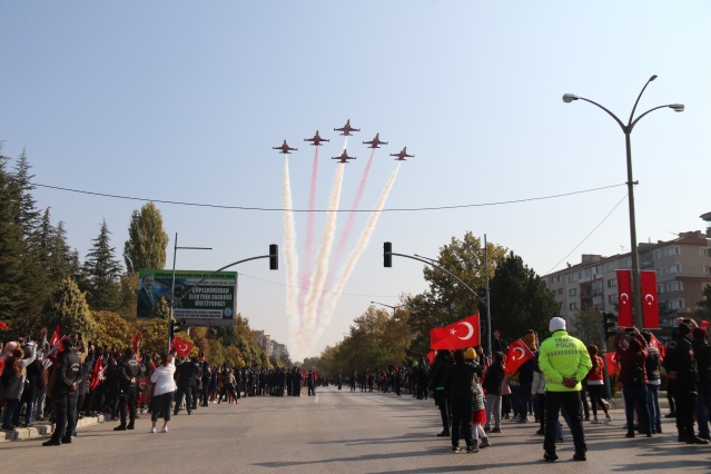 Eskişehir’de cumhuriyetin ilan edilişinin 98’inci yıldönümü, yüzlerce vatandaşın katılımıyla düzenlenen törenle kutlandı. Törende Türk Yıldızları selamlama uçuşu yaptı.