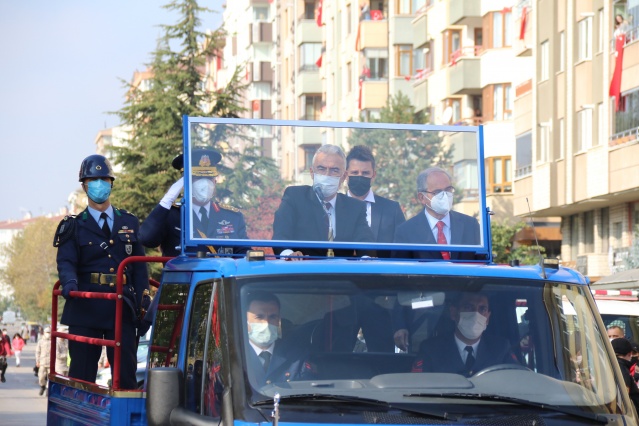 Eskişehir Valisi Erol Ayyıldız, Muharip Hava Kuvveti Komutanı Hv. Orgeneral Atilla Gülan ve Büyükşehir Belediye Başkanı Yılmaz Büyükerşen’in askeri araçla korteje katılan vatandaşları selamlayarak Cumhuriyet Bayramı’nı kutlamasıyla başlayan tören saygı duruşu ve İstikla Marşı ile devam etti.