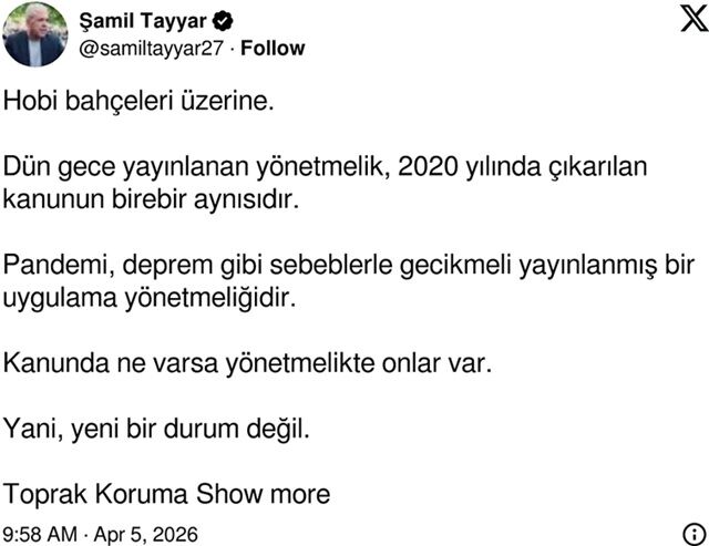 'Hobi bahçeleri üzerine. Dün gece yayımlanan yönetmelik, 2020 yılında çıkarılan kanunun birebir aynısıdır. Pandemi, deprem gibi sebeplerle gecikmeli yayımlanmış bir uygulama yönetmeliğidir. Kanunda ne varsa yönetmelikte de onlar var. Yani, yeni bir durum değil.'