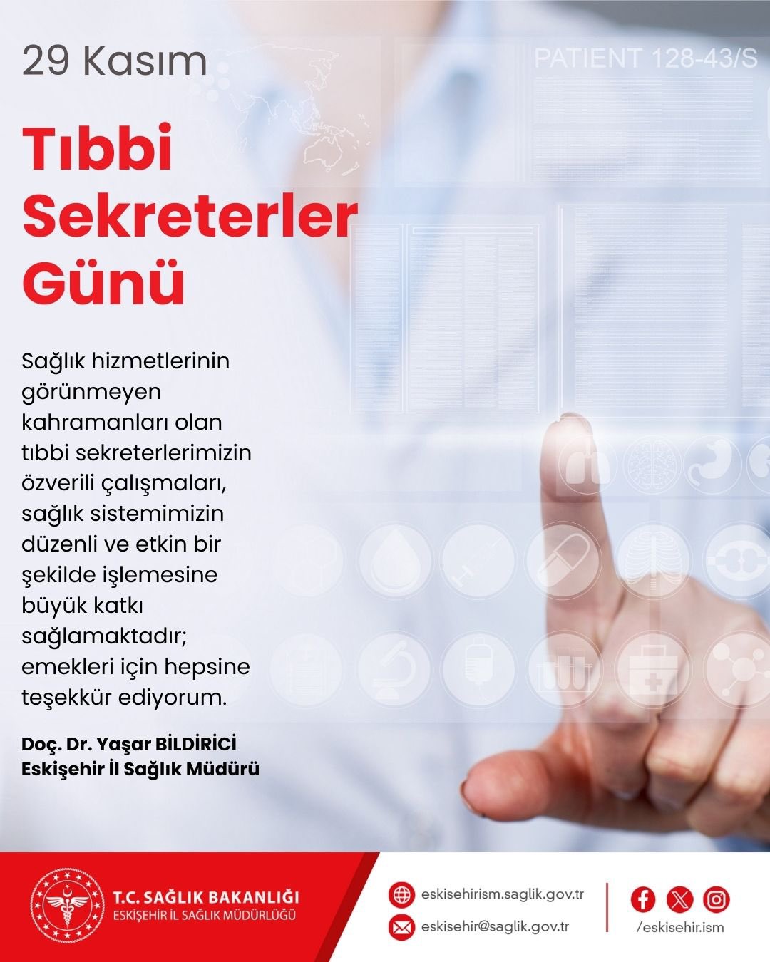 Eskişehir İl Sağlık Müdürü Doç. Dr. Yaşar Bildirici, 29 Kasım Tıbbi Sekreterler Günü dolayısıyla sağlık hizmetlerinin görünmeyen kahramanları olan tıbbi sekreterleri kutladı.