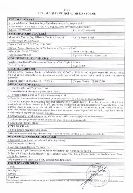 İŞKUR, Sivrihisar Sosyal Yardımlaşma ve Dayanışma Vakfı'nda Evde Yaşlı Bakım Projesi kapsamında çalıştırılmak üzere 1 kişilik geçici işçi alımı yapacağını duyurdu.