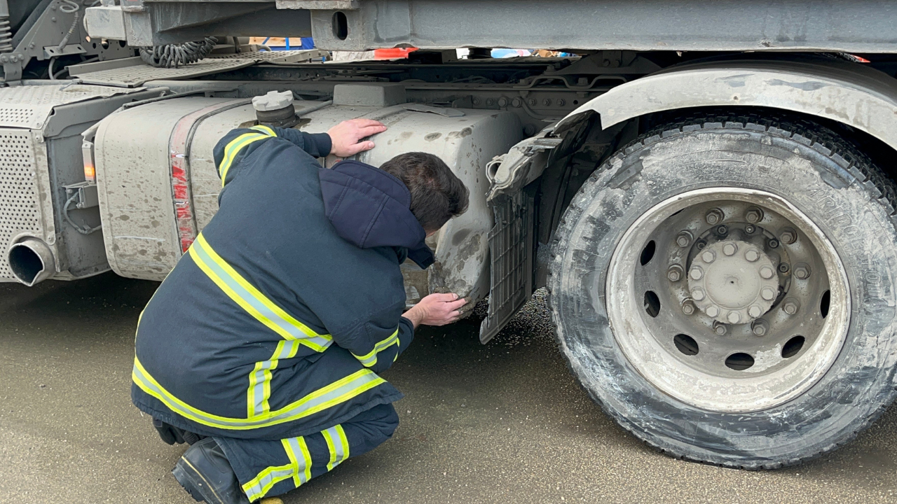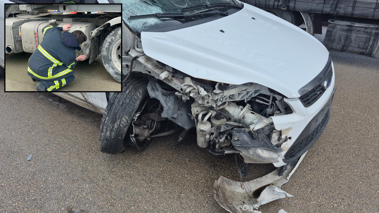 Çarpışmanın şiddetiyle otomobilin sağ ön tekerleği yerinden koparken, tırın yakıt deposu da hasar gördü. Depoda oluşan delikten karayoluna mazot aktı ve yol kısa sürede kaygan hale geldi.