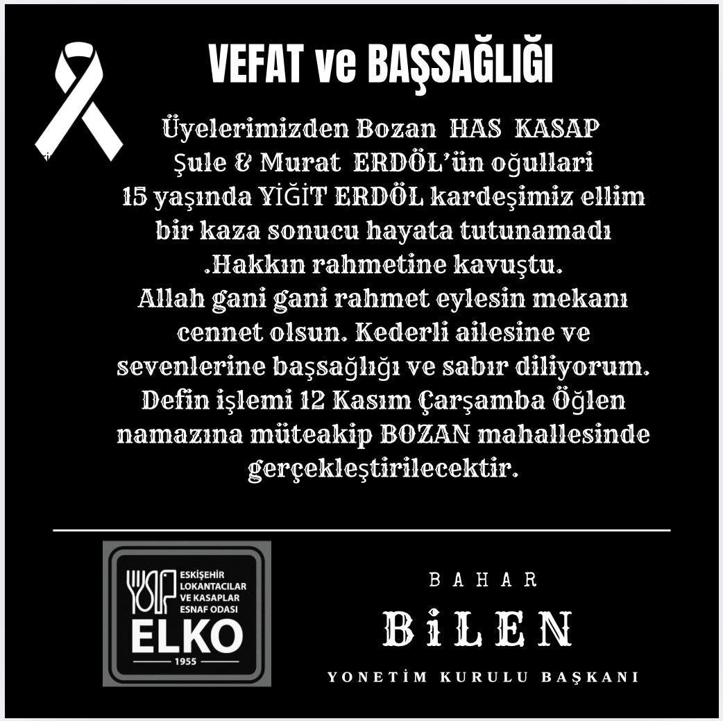 "Seni daima güzel hatıralarınla, tebessümünle anacağız Yiğit Erdöl kardeşim." Mekânın cennet olsun. Eskişehir Gastronomi Derneği kurucu yönetim kurulu üyemiz Bozan Mahallemizin esnaflarından Has Bozan Kasap işletme sahipleri MURAT ERDÖL ve ŞULE ERDÖL Meslektaşımızın evlatları, "YİĞİT ERDÖL" Kardeşimiz, geçirmiş olduğu elim bir kaza sonucu tedavi gördüğü Osmangazi Üniversitesi Hastanesi'nde VEFAT ETMİŞTİR. ALLAH RAHMET EYLESİN. Rabbim, başta anne ve babası olmak üzere tüm ailesine, sevenlerine, arkadaşlarına ve esnaf camiamıza sabır ve metanet diliyorum. Cenazesi 12 Kasım Çarşamba günü, Bozan Mahallesi Camii'nde öğle namazına müteakip kılınacak cenaze namazının ardından Bozan Mezarlığı'na defnedilecektir.