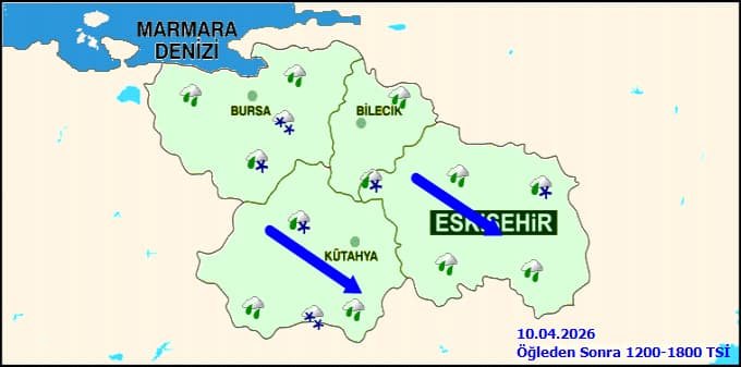 Eskişehir’de 10 Nisan Cuma günü meteorolojik verilere göre, saat 09.00 - 12.00 aralığında karla karışık yağmurla birlikte hava sıcaklığı 7 derece civarında seyredecek. Öğle saatlerine doğru, 12.00 - 15.00 arasında sıcaklık 9 dereceye kadar yükselse de yağış etkisini sürdürecek.