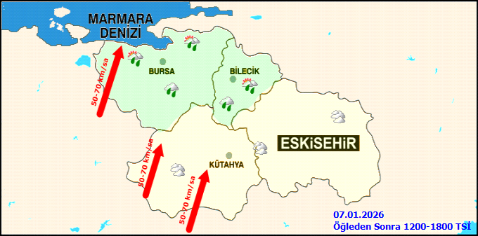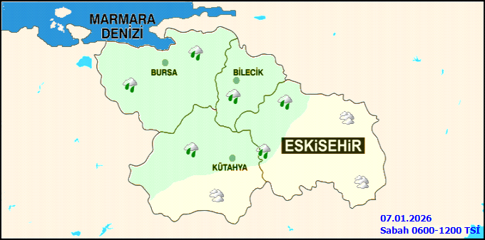 Bölge genelinde havanın parçalı ve çok bulutlu, Bursa ve Bilecik çevreleri ile Kütahya'nın güney ve batı, Eskişehir'in ise batı kesimlerinin sabah saatlerinden itibaren aralıklı yağmur ve sağanak yağmurlu geçeceği tahmin edilmektedir. Gece ve sabah saatlerinde yer yer pus hadisesi beklemektedir.