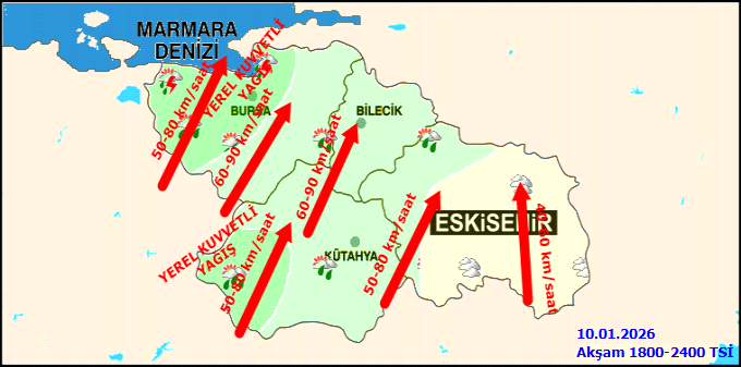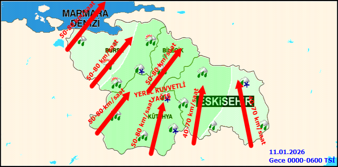 Cumartesi günü akşam saatlerinden itibaren Bursa, Bilecik, Kütahya illeri geneli ile Eskişehir ilinin batı kesimlerinde yerel olarak kuvvetli (21-50 kg/m²) olması bekleniyor. Pazar öğle saatlerinden sonra etkisini kaybetmesi beklenen yağışların Pazar sabah erken saatlerde 800-1000 metre rakımın üzerindeki yüksek kesimlerde karla karışık yağmur ve kar şeklinde olacağı tahmin ediliyor. Kuvvetli yağışlarla birlikte ulaşımda aksamalar, sel, su baskını, yıldırım, kuvvetli rüzgâr ile yükseklerde buzlanma ve tipi gibi olumsuzluklara karşı dikkatli ve tedbirli olunması gerekmektedir.