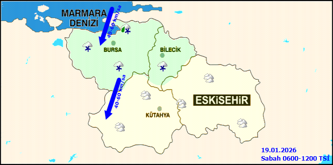 RÜZGAR: Rüzgarların Bursa ve Kütahya çevrelerinde kuzey ve kuzeydoğu, Eskişehir ve Bilecik çevrelerinde ise kuzey ve kuzeybatı yönlerden orta kuvvette; Bursa ve Kütahya'nın batı kesimlerinde zaman zaman kuvvetli (30-60Km/saat), Marmara Denizinde fırtına (50-75Km/saat) şeklinde esmesi beklenmektedir.
