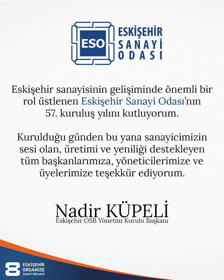 "Eskisehir sanayisinin önemli bir rolü üstlenen Eskisehir Sanayi Odası'nın 57. kuruluş yılını kutluyorum. Kurulduğu gün bu yana sanayicimizin sesi olan, üretim ve yeniliği tüm başkanlarımıza desteklediğimize, üyelerimize ve üyelerimize teşekkür ediyorum."