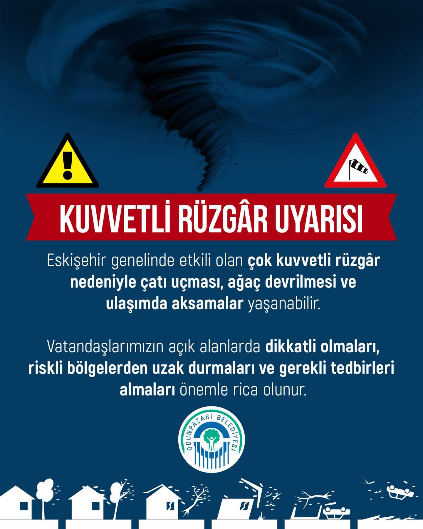 Odunpazarı Belediyesi, Eskişehir genelinde etkili olan çok kuvvetli rüzgar nedeniyle vatandaşları uyardı. Belediyenin resmi sosyal medya hesabından yapılan açıklamada, kuvvetli rüzgârın çatı uçması, ağaç devrilmesi ve ulaşımda aksamalar gibi olumsuzluklara yol açabileceği belirtildi.